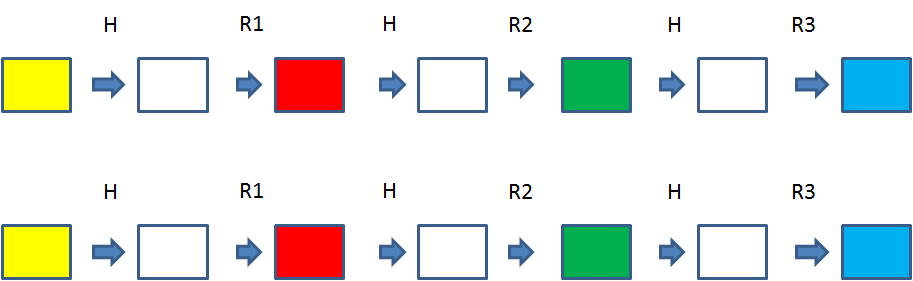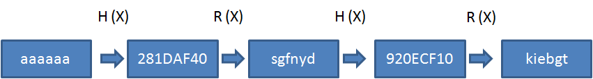 通过交替运算H和R若干次,可以形成一个原文和哈希值的链条。假设原文是aaaaaa,哈希值长度32bit,那么哈希链表就是下面的样子: