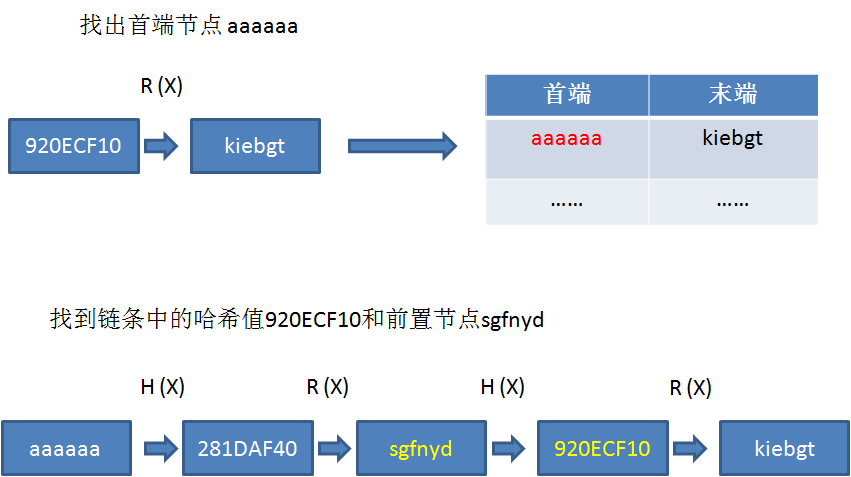 查询哈希表可以找到末端kiebgt对应的首端是aaaaaa,因此摘要920ECF10的原文“极有可能”在aaaaaa到kiebgt的这个链条当中。
