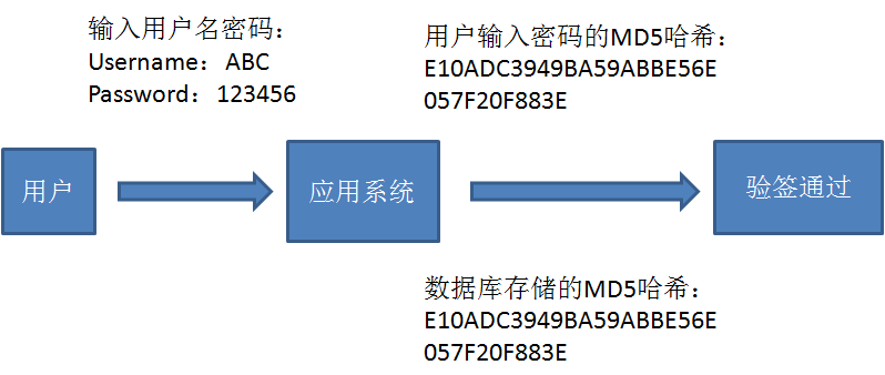 MD5碰撞通常用于登陆密码的破解。应用系统的数据库中存储的用户密码通常都是原密码的MD5哈希值,每当用户登录时,验签过程如下: