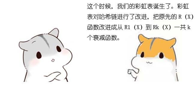 这个问题看似没什么影响,既然找不到就重新生成一组首尾映射即可。但是想象一下,当K值较大的时候,哈希链很长,一旦两条不同的哈希链在某个节点出现碰撞,后面所有的明文和哈希值全都变成了一毛一样的值。