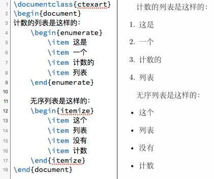 最后再介绍两个环境吧。一个是计数列表,一个是无序列表。计数列表的环境名称是 enumerate,无序列表的环境名称是 itemize。下面是示例: