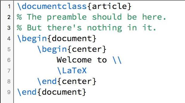 这个文档的全部内容就是 Welcome to LaTeX 。当初为了将它作为题图,我希望它居中,于是放在了 center 环境里。我又希望它分两行呈现,因此在 Welcome to 后面加了一个强制断行命令。这里可能有人会问了,为什么已经按了回车,它却不断行呢?这里涉及到一个 LaTeX 中的基本规则,就是在一般情况下,一个换行、一个空格和多个空格这三种东西表达在输出文档中都是一个空格,而换行则需要连续两个换行符才能实现。与之等价的命令就是“\\”,它在排版表格等需要强制换行对齐的环境中非常有用,在正文中也可以使用。在这里,你也可以尝试把它删去,再用两个回车代替,看看排版效果是不是相同。