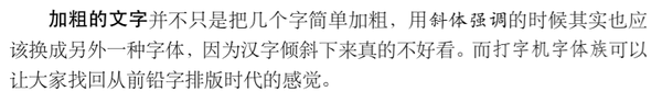 LaTeX 中基本的字体。其中无衬线字体主要用于幻灯片展示,因为在距离较远的情况下,衬线对文字形状的识别没有任何用处,所以用无衬线字体来提升观众对文字的识别(所以不要再用宋体和 Times New Roman 做幻灯片了)。打字机字体具有字体等宽的性质,适合排版代码和抄录,方便对齐。意大利和加粗一般用于强调,意大利还可以用于引用他人的文字。通常情况下,罗马字体族就可以满足我们的大部分要求。一个文档中最好不要出现三种以上完全不同的字体,那样会显得非常杂乱。在汉语中也有对应的字体划分方法。一般罗马就是宋体,意大利是楷体,打字机是仿宋(毕竟汉字全部都等宽),加宽加粗还有无衬线都是黑体。现在大家要明白一点,加粗并不只是把原来的文字加粗,而是用另一种字体来起到你想达到的效果。以上这三种字体的配合基本上就可以满足学术文档中的全部需求了。我们举一个例子: