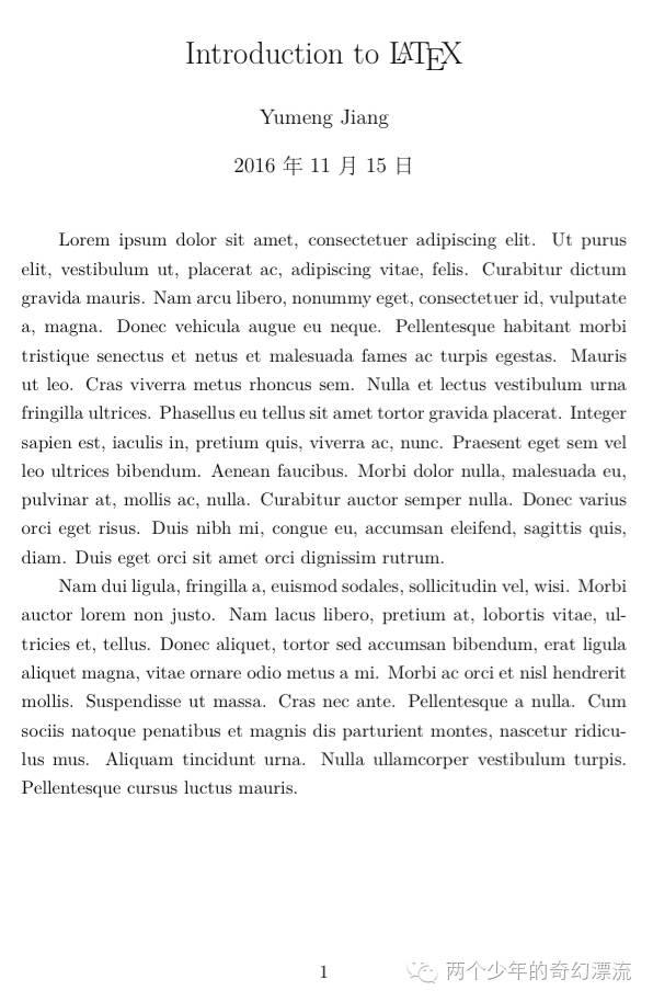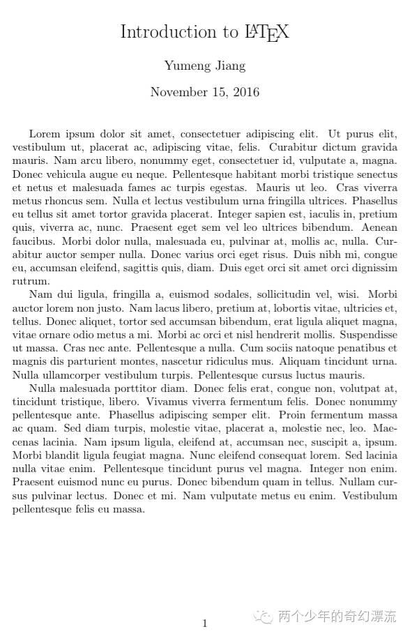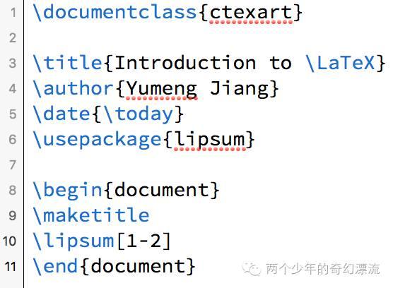 \usepackage:调用宏包;此处调用的宏包是 lipsum,用于生成随机文字(上面满篇的洋文其实都是生成的);第10行的 \lipsum[1-2] 表示插入随机文字的前两段;
