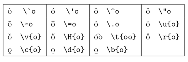 UTF-8 编码系统可以支持这些字符,但是我们没有办法直接从键盘上输入。这里我们就需要 LaTeX 中的一些命令来生成这些符号。下面以 o 为例,看看特殊的声调是怎么生成的: