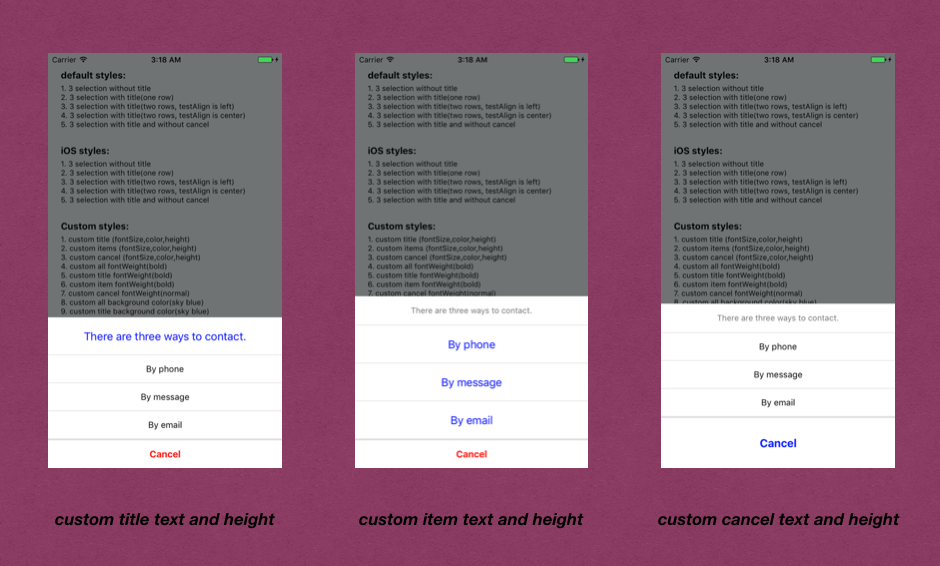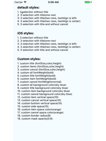 在该组件里:最顶部的标题,中间的选择项,最底部的取消项都是可有可无的,而且每一部分的字体,颜色,高度,距离,分割线颜色,圆角等也都是可以定制的。
