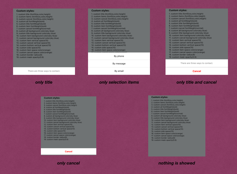 高度解耦的程度可以通过这最后一张图看出来:主标题,选择项,取消项都可以根据传入属性的情况来展示,互不影响。而且在都不设置的情况下,只展示了灰色的底部mask。