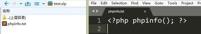 假设有个文件phpinfo.txt,其内容为<?php phpinfo(); ?>,打包成zip压缩包,如下: