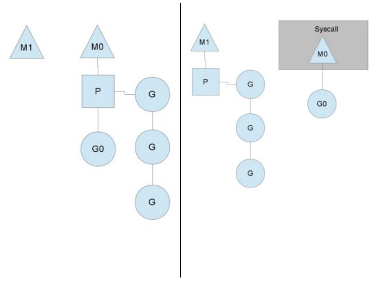 b. 如果某个M在执行G的过程中被G中的系统调用阻塞了,怎么办?