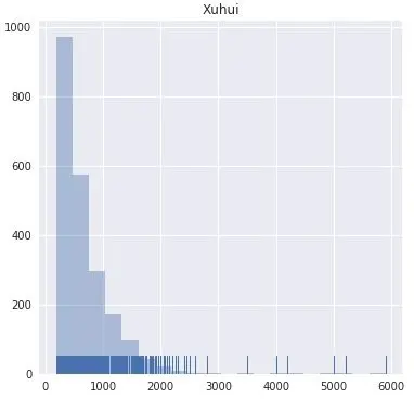 temp = sh[sh.Dist == 'Xuhui'] plt.figure(1,figsize=(6,6)) plt.title('Xuhui') sns.distplot(temp.Tprice,kde=False,bins=20,rug=True) plt.xlabel(' ') plt.show()