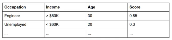 每一个训练实例通常表示为一组固定的属性或特征。特征是用来表示每一个实例的方式。例如,在案例1中,一张图片可以由每个像素的灰度级别来表示。在案例2中,推文可以用推文中出现的字词来表示。在案例3中,信用记录可以用此人的年龄、薪水、职业等来表示。