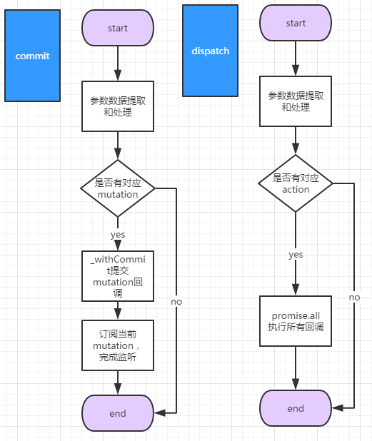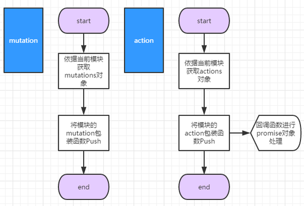 在store环境里有两个属性:_mutations和_actions分别用来存储模块定义的mutations和actions,依据当前模块的类型进行查找对应的内部属性对象,并且将模块对应的回调函数进行包装插入到对应属性对象里,到此即完成注册工作。二者差别在于包装回调函数处理上的不同,mutation直接将回调函数包装起来即可,action对于回调函数的结果进行Promise对象的处理,然后包装。