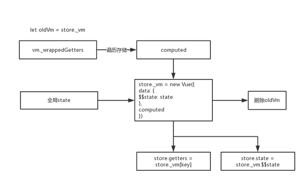 核心内容是store._vm这样一个内部变量,本质上将注册后的state和getters作为新的数据源实例化一个Vue对象传递给store._vm,并且删除旧的store._vm。与此同时,定义store.getters.xxx=store._vm[xxx],从而完成使用getters的正确姿势。state的使用是由store内部提供了一个api,调用这个api返回store._vm.data.?http://state.xxx,在更新store._vm之后,就可以访问这个模块的state。