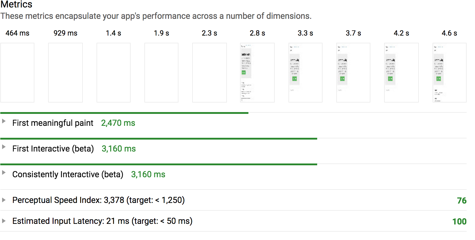 正如你所看到的,我的应用程序First Meaningful paint时间缩短了将近1秒,到达可交互状态的时间节省了0.5秒。实际中,你的应用程序可能无法获得如此惊人的改善,因为我的CSS很笨重(我包含了整个Bootstrap库),而且在这样一个简单的应用程序中,我没有很多关键CSS规则。