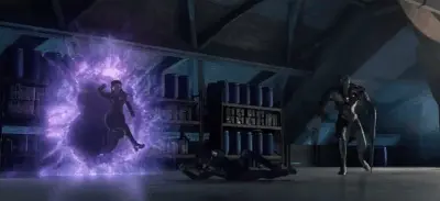 你看一个哨兵机器人扑过来攻击一个X战警,范冰冰从一个传送门里神速穿越而来,顺手又甩出两个传送门,让哨兵机器人扑进了一个传送门,从另一个传送门一个踉跄掉了出来,从而救了那个X战警。