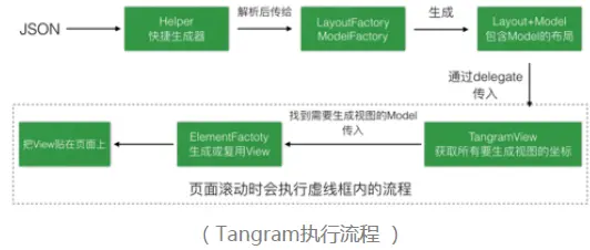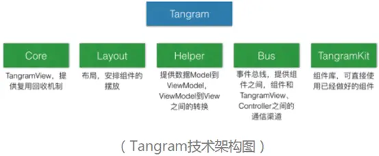 tangram在架构上分成了Core、Layout、Helper、Bus、TangramKit五个部分: ▪ Core,TangramView是整个框架的主入口,同时也提供了回收复用机制。
