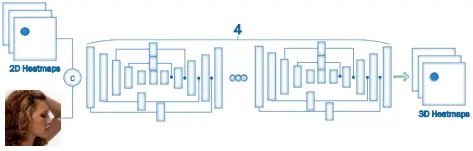 2D-to-3D-FAN网络架构:基于人体姿态估计架构HourGlass,输入是RGB图像和2D面部地标,输出是对应的3D面部地标。