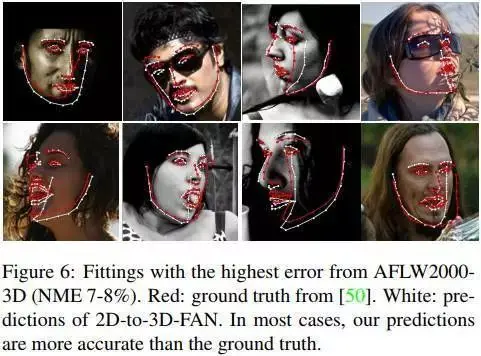 但是,这也带来了一个问题,那就是评估2D转3D数据很难。现有的最大同类数据集是AFLW2000-3D。于是,作者先使用2D-FAN,生成2D面部地标标注,再使用2D-to-3D-FAN,将2D数据转换为3D面部地标,最后将生成的3D数据与AFLW2000-3D进行比较。