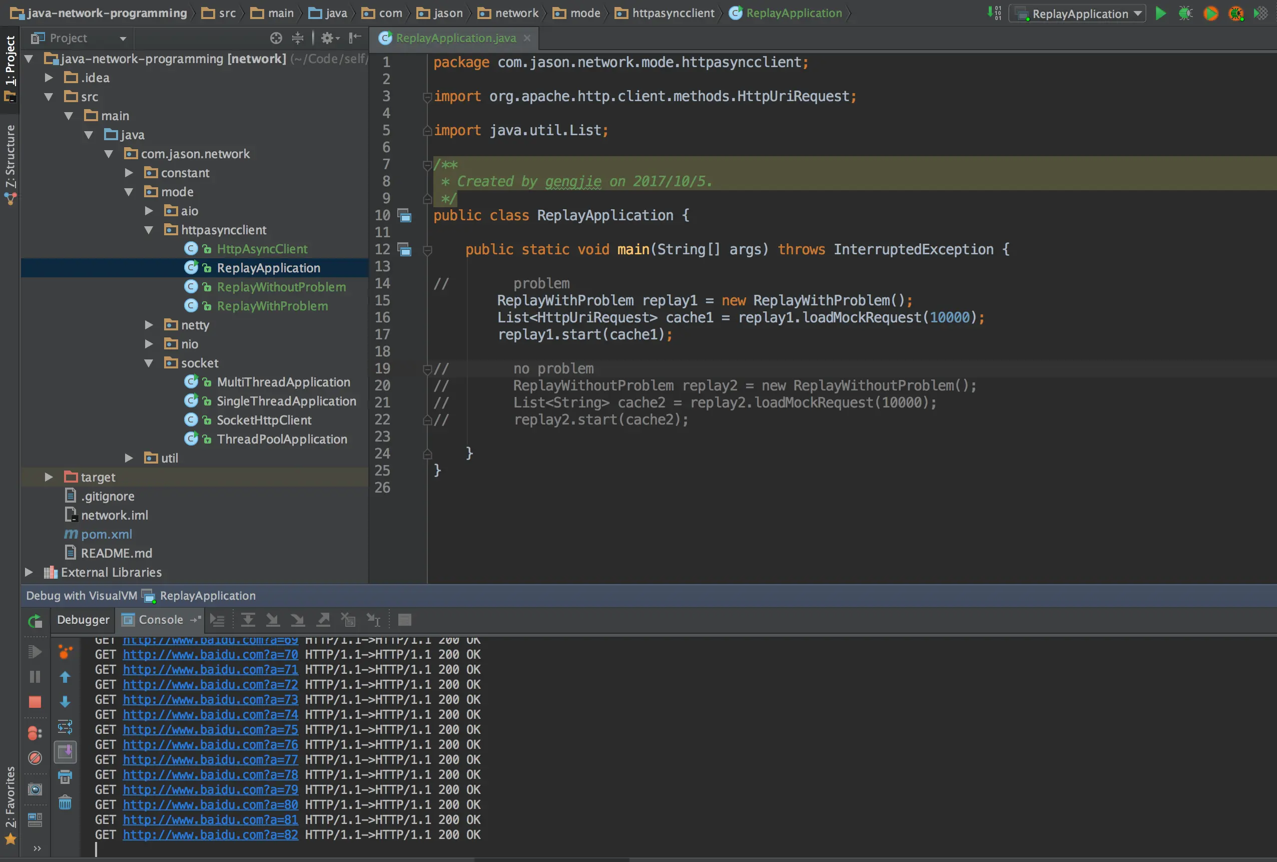 Demo 的主要逻辑是这样的,首先创建一个缓存列表,用来保存需要发送的请求数据。然后,通过循环的方式从缓存列表中取出需要发送的请求,将其交由 httpasyncclient 客户端进行发送。
