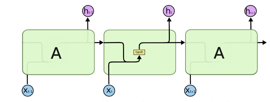 图2.6 标准RNN模型中的重复模块包括1层结构