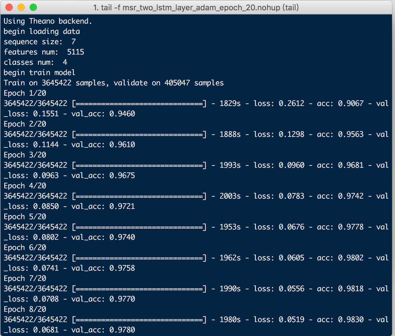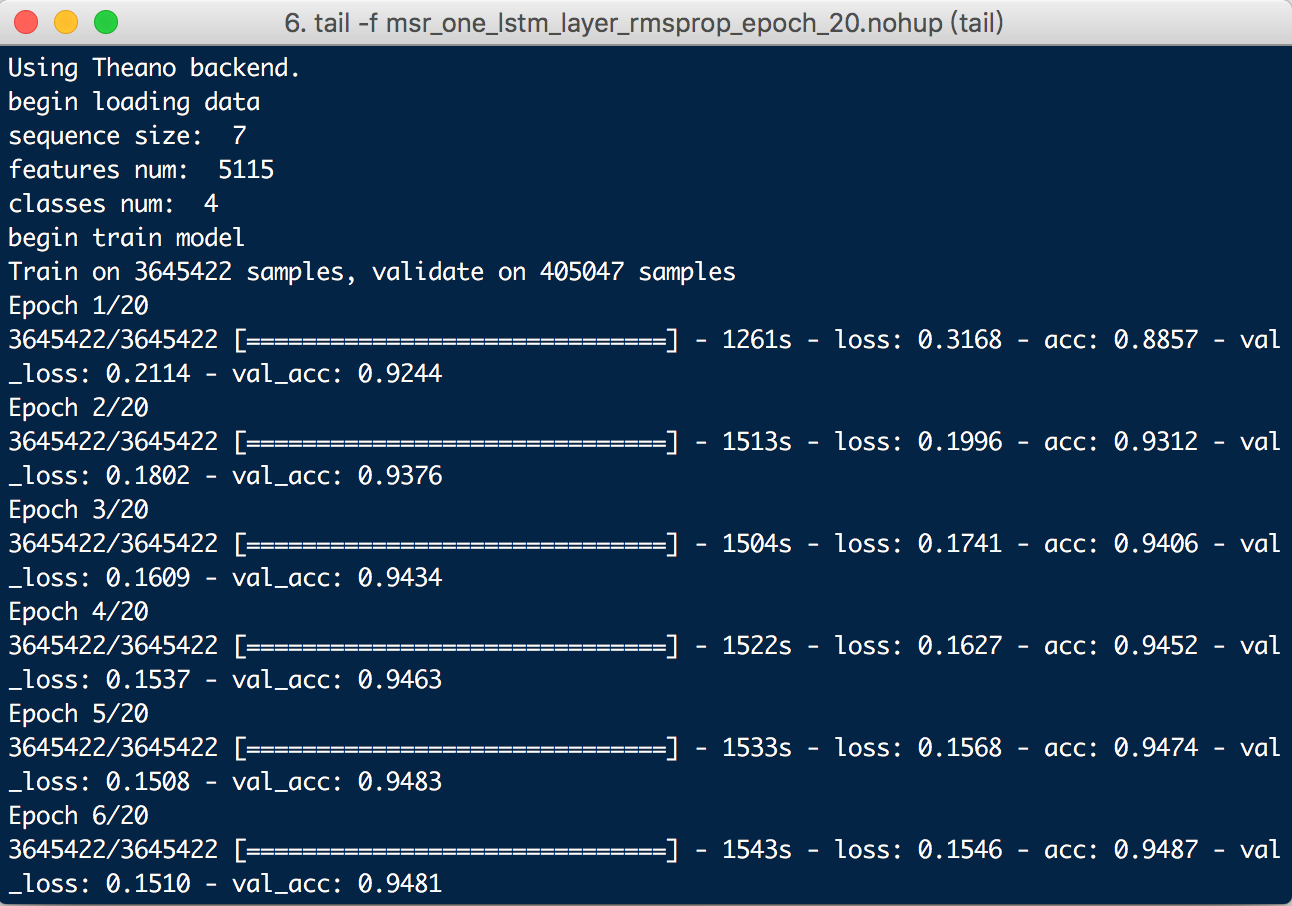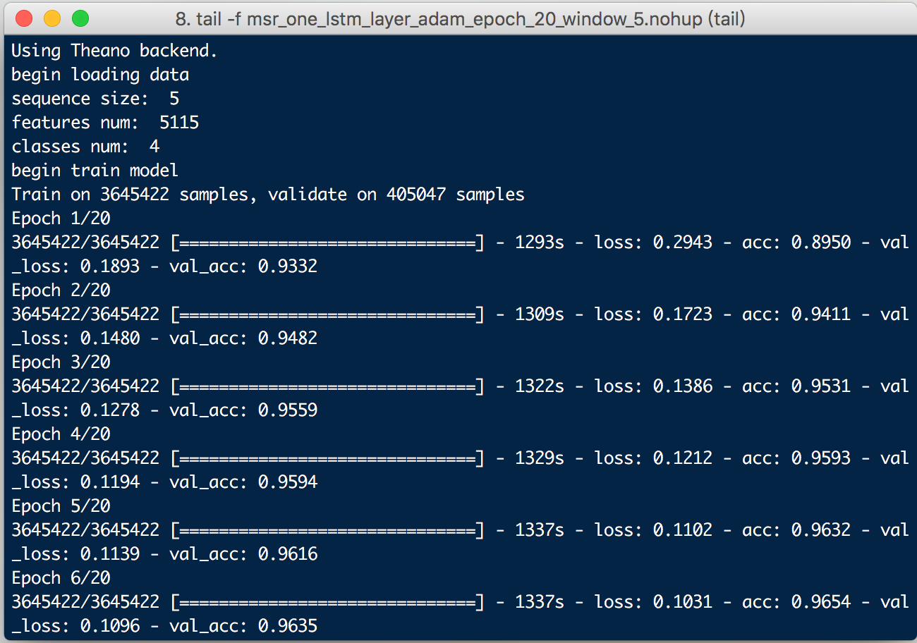 其中,输入的维度input_dim 是字符类别总数,hidden_node 是隐藏层的结点个数。在上面的模型中,第一层输入层Embedding的作用是将输入的整数向量化。在现在这个模型中,输入是一个一维向量,里面每个值是字符对应的整数,Embedding层就可以将这些整数向量化,简单来讲就是生成了每个字的字向量。接下来紧跟着一层是LSTM,它输出维度也是隐藏层的结点个数。Dropout层的作用是让一些神经节点随机不工作,来防止过拟合现象。Dense层是最后的输出,这里nb_classes的数目是4,代表一个字符的label。模型建立好后开始训练,重复20次,训练的结果如下: