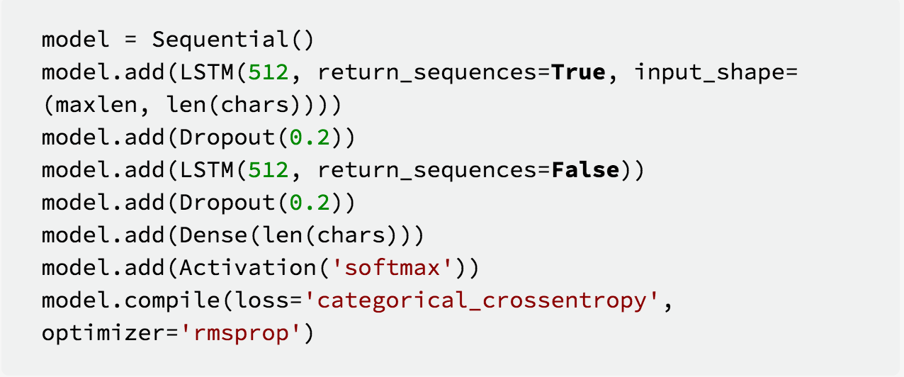 在模型设计上,主要是使用了两层LSTM,每层的输出维度为512,并在每层LSTM后面加入了Dropout层,来防止过拟合。整个模型的输入维度是字符类别的个数,输入字符串长度是40,模型的输出维度也是字符类别长度。整个模型表达的意思是每输入40个字符,就会从模型中输出一个预测的字符。因为LSTM的对长依赖term的记忆性,因此在上下文很长(40个字符)的情况下也可以表现的很好。