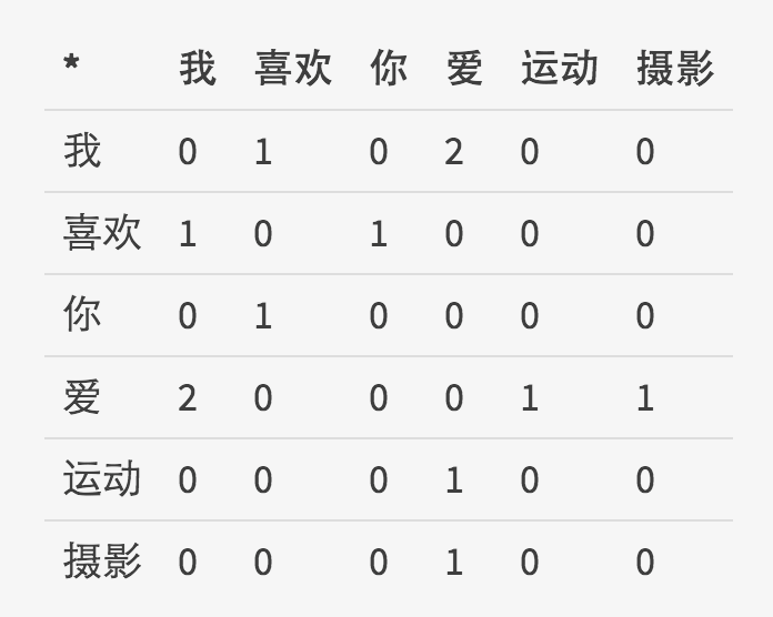 考虑用一个固定窗口大小的文本片段来解决维度变化问题,如果在这样的片段中,两个词出现了,就认为这两个词有关。举例来讲,有以下三句话: “我\喜欢\你”,“我\爱\运动”,“我\爱\摄影”,如果考虑窗口的大小为1,也就是认为一个词只和它前面和后面的词有关,通过统计共现次数,我们能够得到下面的矩阵。