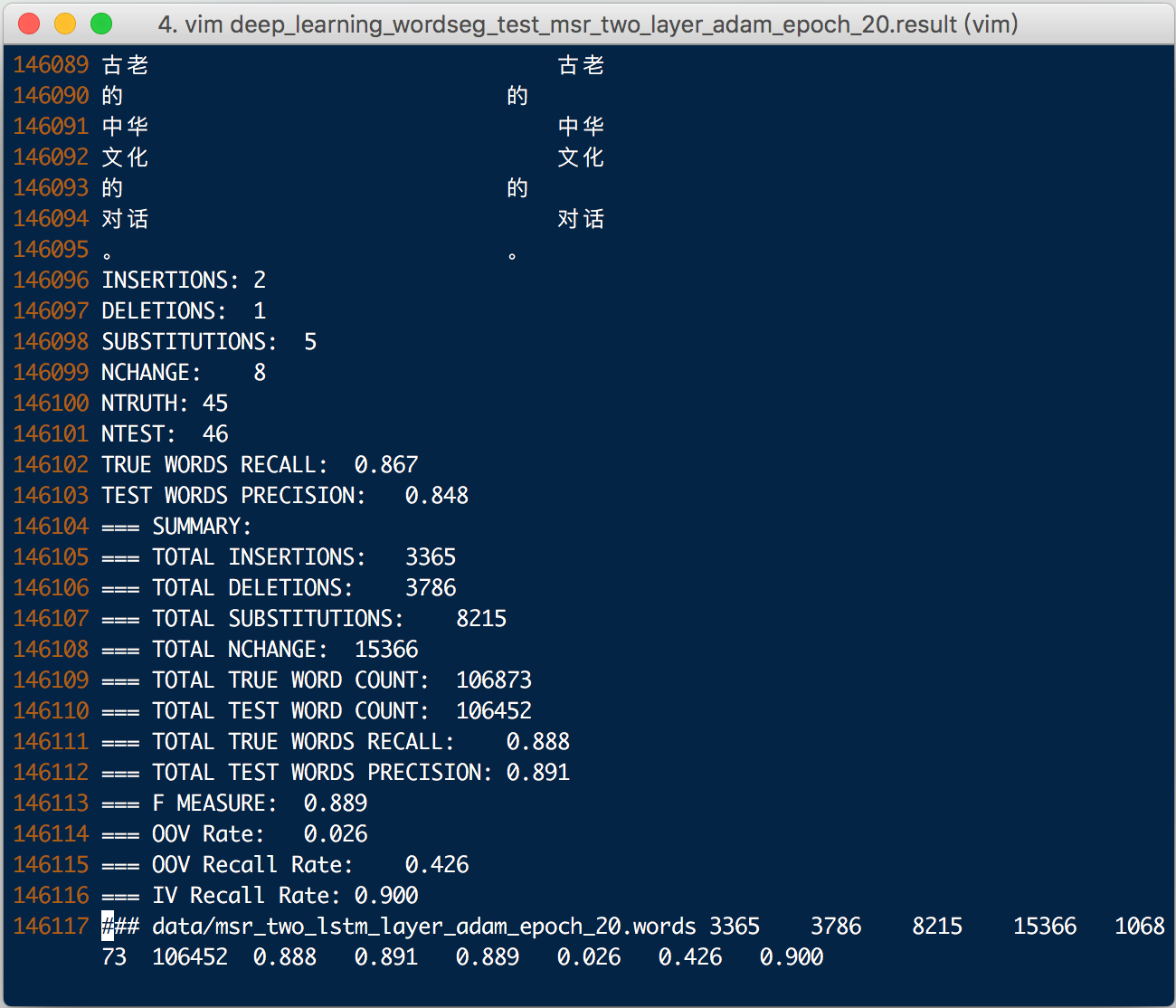 训练好后,我们使用msr_test的测试数据进行分词,并将最终的分词结果使用icwb2自带的脚本进行测试,结果如下:
