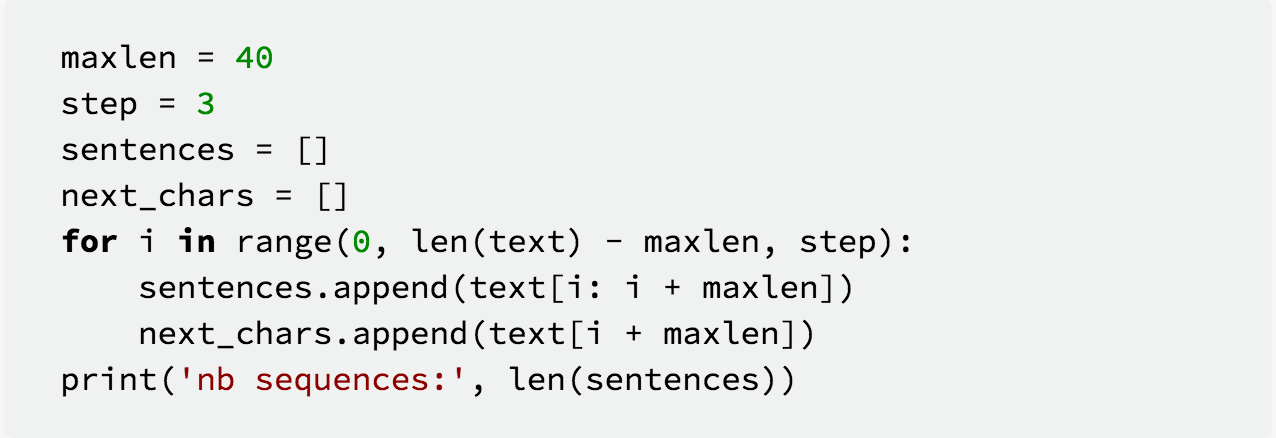 这段代码是数据准备的情况。将尼采全文进行数据切割,每40个字符为一个片段,将紧接这个片段的字符作为预测值,来进行训练。字符片段的间隔为3。