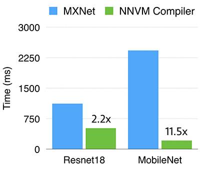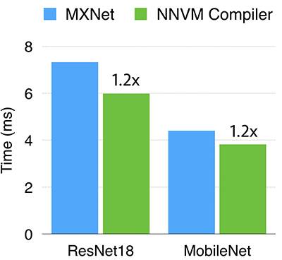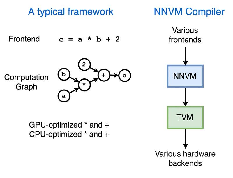 新的编译器,NNVM编译器,基于TVM堆栈中的两个组件:用于计算图的NNVM和用于张量运算符的TVM。