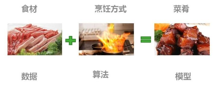 机器学习是机器通过统计学算法,对大量的历史数据进行学习规律从而生成经验模型,利用经验模型对新的样本做出智能识别或对未来做出预测,从而指导业务。机器学习严格定义为:不显式编程地赋予计算机能力的研究领域。机器学习的组成是有数据、算法、模型构成的,数据+算法生成模型,通过进行预测和模式识别,进而提供智能化的服务和产品;参考图3:机器学习和烹饪的形象对比,更好理解机器学习。
