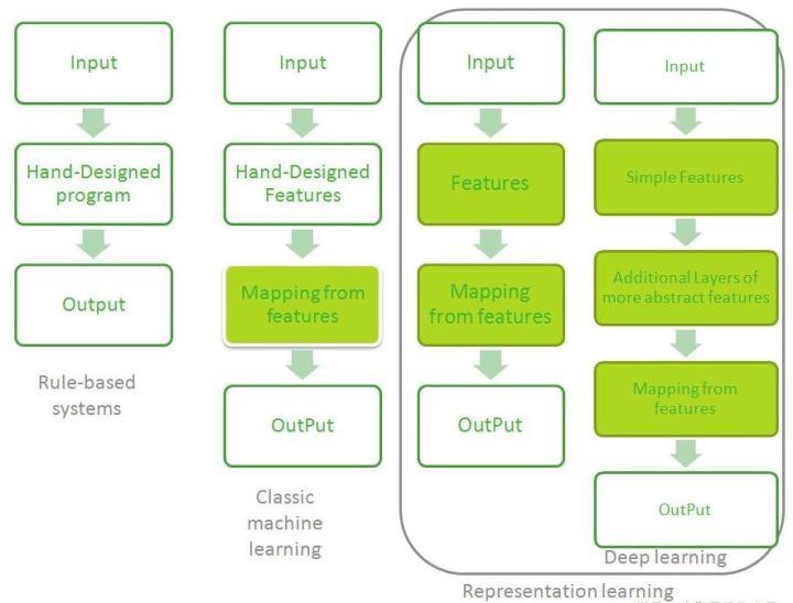 特征处理方式:深度学习有一个振奋的优点,它可以自动的从数据中提取特征。深度学习通过其他较简单的表示来表达复杂表示。
