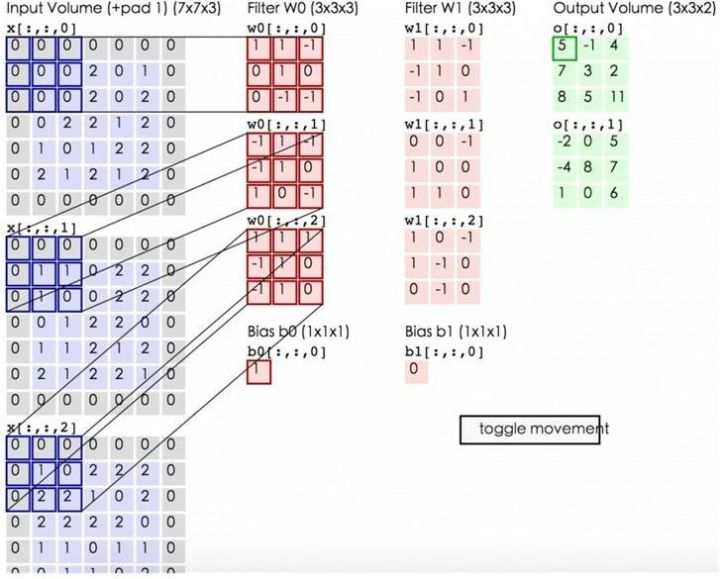 图13简要的描述了卷积层是如何工作的,其中I是原始的输入图像,K是卷积层中的过滤器(filter)。过滤器是按照空间顺序排列的一系列的参数的集合。在图中这个过滤器是一个3x3的矩形。其中矩形区域填充了9个参数。通过过滤器在原始图像中不断滑动(红色区域,这个区域从图像的左上角一直滑动到右下角),覆盖的红色区域和过滤器的参数按照顺序两两相乘,最后求和得到一个数(I*K)中的绿色区域。这样就进行了一次卷积的运算。通过使用多个不同的过滤器可以从一个原始的图像出发生成包含有原始图像不同特征的新图像。