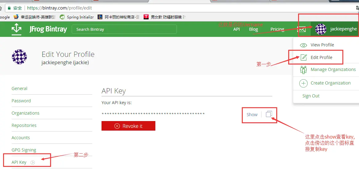 key = properties.getProperty("bintray.apikey")// Bintray刚才保存的ApiKey。