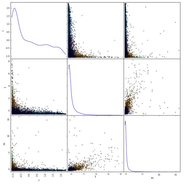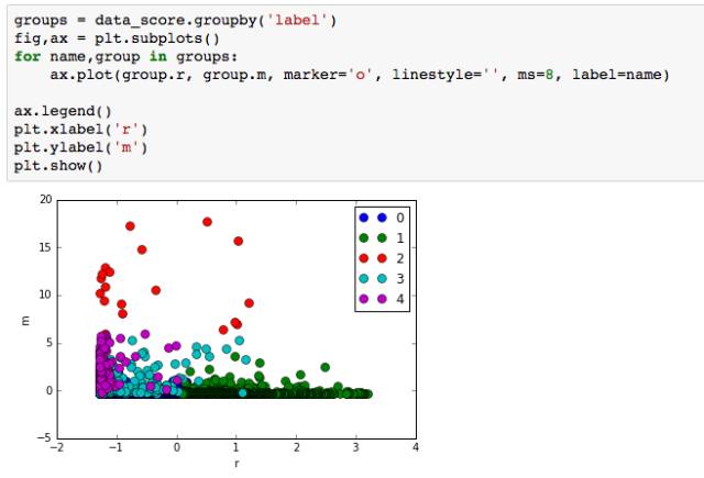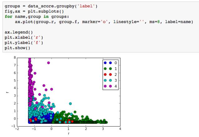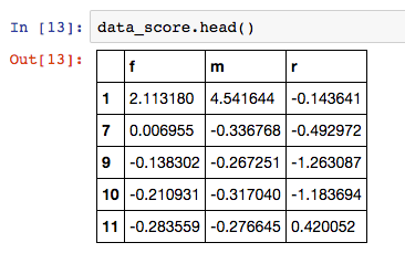 上图的三列数据是经过标准化后的用户消费数据。值越接近0,说明离平均水平越近。r值因为是最近一次消费时间,所以值越小,说明时间越接近,值越大,说明消费越久远。