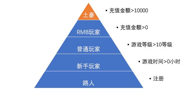 上图是一个简化的游戏用户分层,每层指标都是可量化的。为了上下层用户清晰,群体间应尽量独立,即计算RMB玩家时,应该把土豪玩家排除,计算普通玩家时,应该把结果中包含的上两层排除,这样运营的针对性才强。