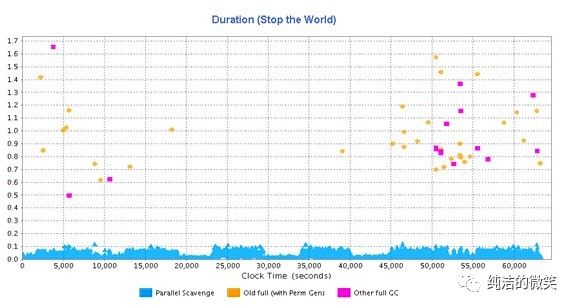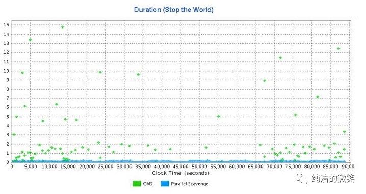 上图是由HPJMeter生成的图片之一。横坐标表示JVM执行的时间,纵坐标表示每次GC的时间。CMS为绿点,表示Full GC的结果,而Parallel Scavenge为蓝点,表示Minor GC的结果。