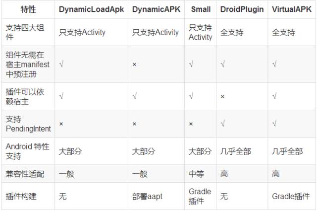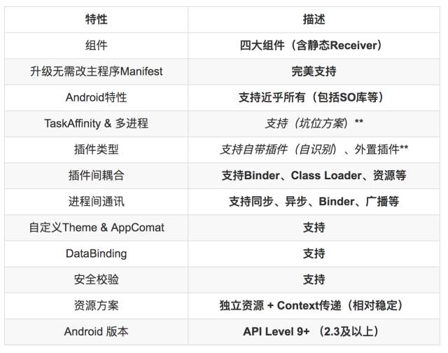 1.Activity:支持显示和隐式调用,支持Activity的theme和LaunchMode,支持透明主题;2.Service:支持显示和隐式调用,支持Service的start、stop、bind和unbind,并支持跨进程bind插件中的Service;3.Receiver:支持静态注册和动态注册的Receiver; 4.ContentProvider:支持provider的所有操作,包括CRUD和call方法等,支持跨进程访问插件中的Provider。5.自定义View:支持自定义 View,支持自定义属性和style,支持动画;6.PendingIntent:支持PendingIntent以及和其相关的Alarm、Notification和AppWidget; 7.支持插件Application以及插件manifest中的meta-data;8.支持插件中的so。
