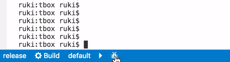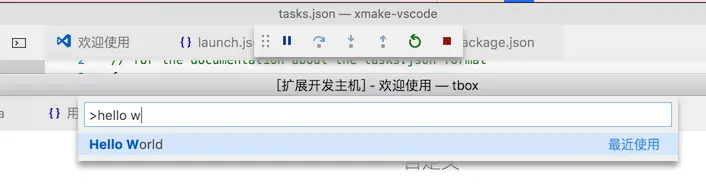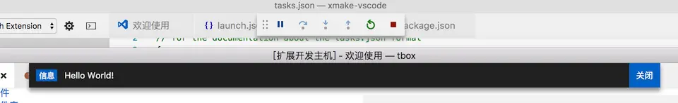状态栏上的按钮是可以响应之前创建的那些命令的,例如:xmake.sayHello等,下面我们在状态栏上创建一个debug按钮,用来调试运行xmake构建的程序: