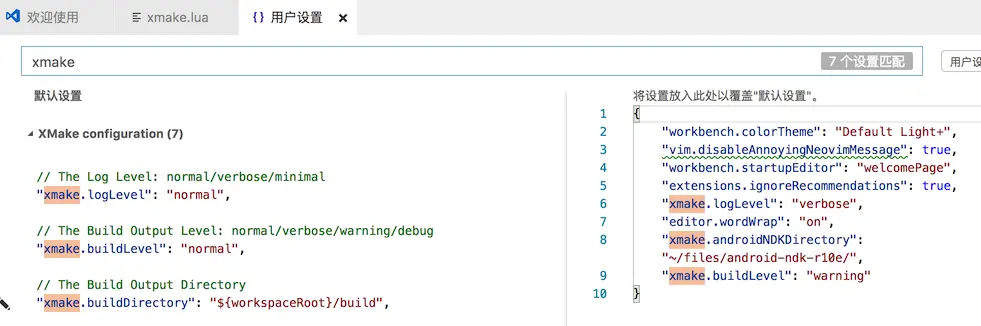 }上述配置,增加了三个配置项,都在xmake.域下面,可在vscode配置中直接搜索xmake相关字样就能方便找到。