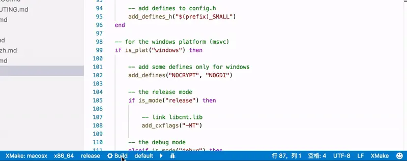 在xmake-vscode的状态栏上,我们还增加了几个快速配置的状态按钮,用于快速切换不同的平台、架构、编译模式,例如: