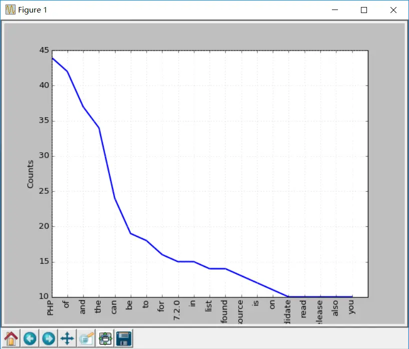 如果搜索输出结果,可以发现最常见的token是PHP。 您可以调用plot函数做出频率分布图: