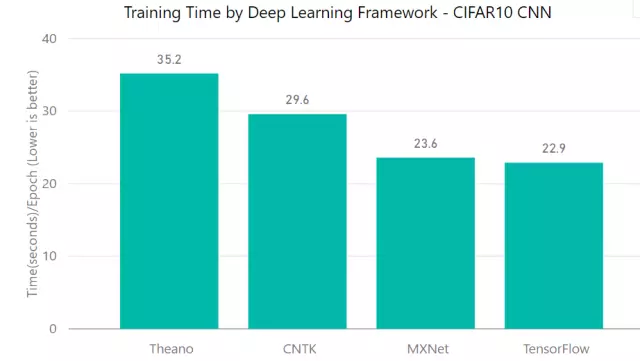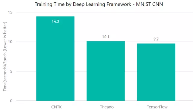 MXNet没有参与本组实验。Tensorflow和Theano的性能差不多,CNTK比它们快了50%,只需9.5s/epoch。
