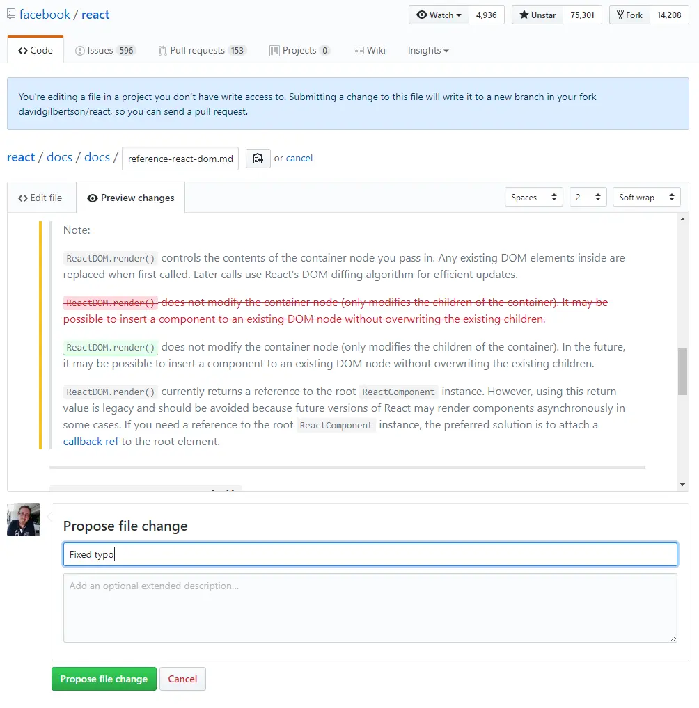 在GitHub上打开一个文件(任何仓库的任何文件),在页面的右上角有一个像小铅笔的按钮。点击它,你就可以编辑文件了。当你编辑完成,点击Propose file change,GitHub将为你fork这个仓库,然后创建pull request。