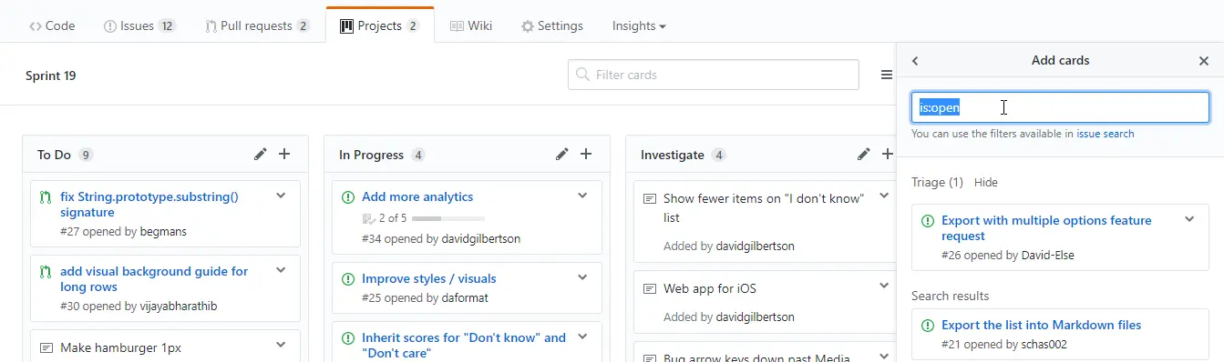 如果你想把你的issues添加到你的项目管理中来,你可以在页面右上方点击Add Cards搜索你想添加的,这里的搜索有特殊的语法,比如输入is:pr is:open,意味着你可以找到所有打开的PRs,如果你想修复bugs,输入label:bug。