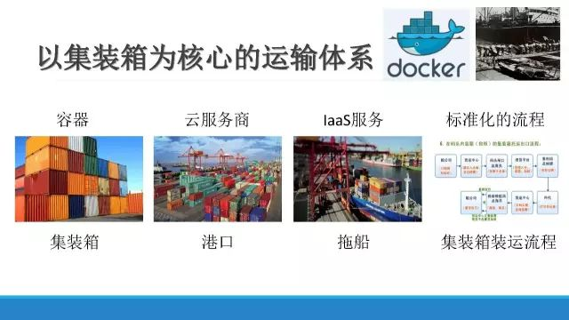 若把容器迁移过程想象为以集装箱为核心的运输体系,那概念之间可以这样对应:容器是集装箱,云服务提供商是装载集装箱的港口,云服务商提供一些IaaS的服务可以理解为装载集装箱的拖船,同时在进行部署运行的过程中有一套标准化的流程,可以将其看做装运流程。