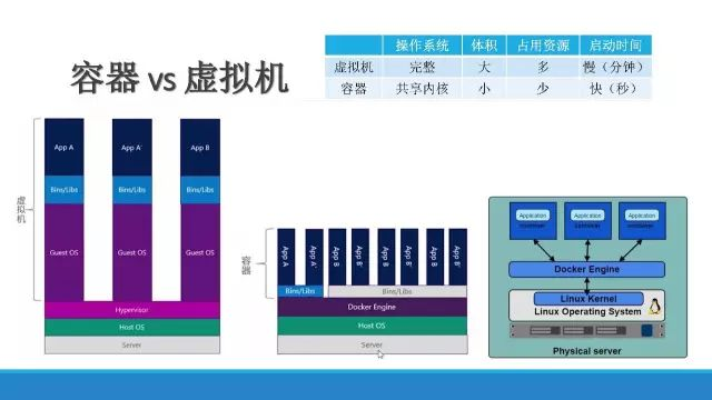 启动:在启动虚拟机的过程当中要从操作系统去启动,因此启动较慢,而容器的启动时间是秒级的。