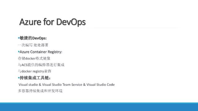 镜像仓库是可以和Docker的镜像仓库兼容的,所以如果使用的是Docker工具,也可以进行无缝迁移,同时在Azure上使用容器化服务以及一系列持续集成工具链包括Visual Studio Visual Studio Team Service以及Visual Studio Code,通过一系列的集成工具链即可构建版本代码库,同时进行人员分配的管理调度,达到更好的持续集成、持续交付概念。