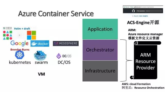 之前说到的Infrastructure和以上编排工具都通过Azure的ARM模型进行构建,大家知道AWS有Cloud Formation,阿里云上有Resource Orchestration,类似于这种模板文件,Azure上有自己的ARM文件,可以用一些很简单的输入,通过ARM模板在Azure进行部署,除了可以在Azure的Portal上或Azure CLI上去创建Azure Container Service,也可以通过ACS的Engine去创建,使用一些简单输入的定义文件用ACS Engine转化为ARM模板,从而快速去创建部署,ACS Engine现在是开源在GitHub上的,用户可以在其中快速更改自己的部署,从而进行一些自定义的容器服务,我们也希望这些开源的代码能够对社区做出贡献,也帮助我们ACS的服务更快更好地发展。