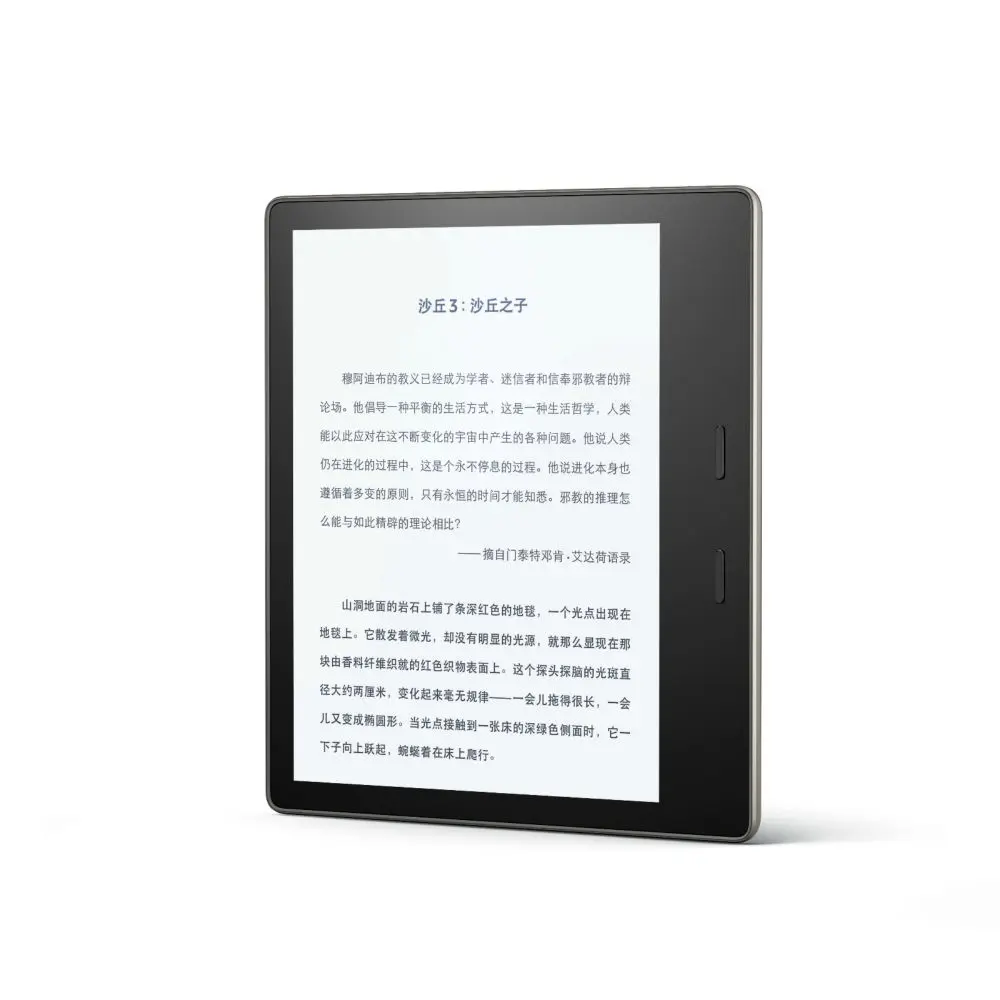 上代 Kindle Oasis 定位旗舰,是所有系列中最轻薄的 Kindle,本次升级将屏幕从 6 英寸扩大到了 7 英寸,依然是窄边框,屏占比很高,每页显示的内容较上一代增加了 30%。这也是目前屏幕最大的 Kindle 设备,用户在阅读时能够减少翻页操作。